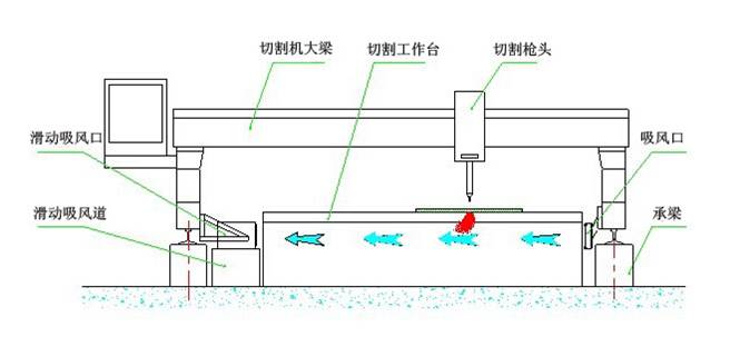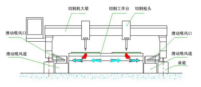 側(cè)吸式煙塵凈化系統(tǒng)采用吸風(fēng)口固定在切割機(jī)龍門架上,吸風(fēng)口與吸風(fēng)道之間通過(guò)密封皮帶密封,吸風(fēng)口可隨龍門架在吸風(fēng)道上來(lái)回移動(dòng)吸風(fēng),將切割的粉塵吸除。