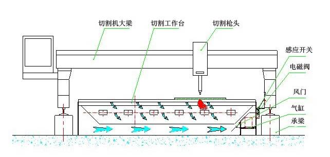 下吸式煙塵凈化系統(tǒng)抽風(fēng)是通過(guò)下吸式抽風(fēng)切割臺(tái)來(lái)實(shí)現(xiàn)的,下吸式抽風(fēng)切割臺(tái)分成若干個(gè)區(qū)域,每個(gè)區(qū)域設(shè)計(jì)有風(fēng)門吸風(fēng),切割槍頭在每個(gè)區(qū)域切割時(shí),相應(yīng)區(qū)域的風(fēng)門打開(kāi)抽風(fēng),將切割機(jī)的粉塵吸除。